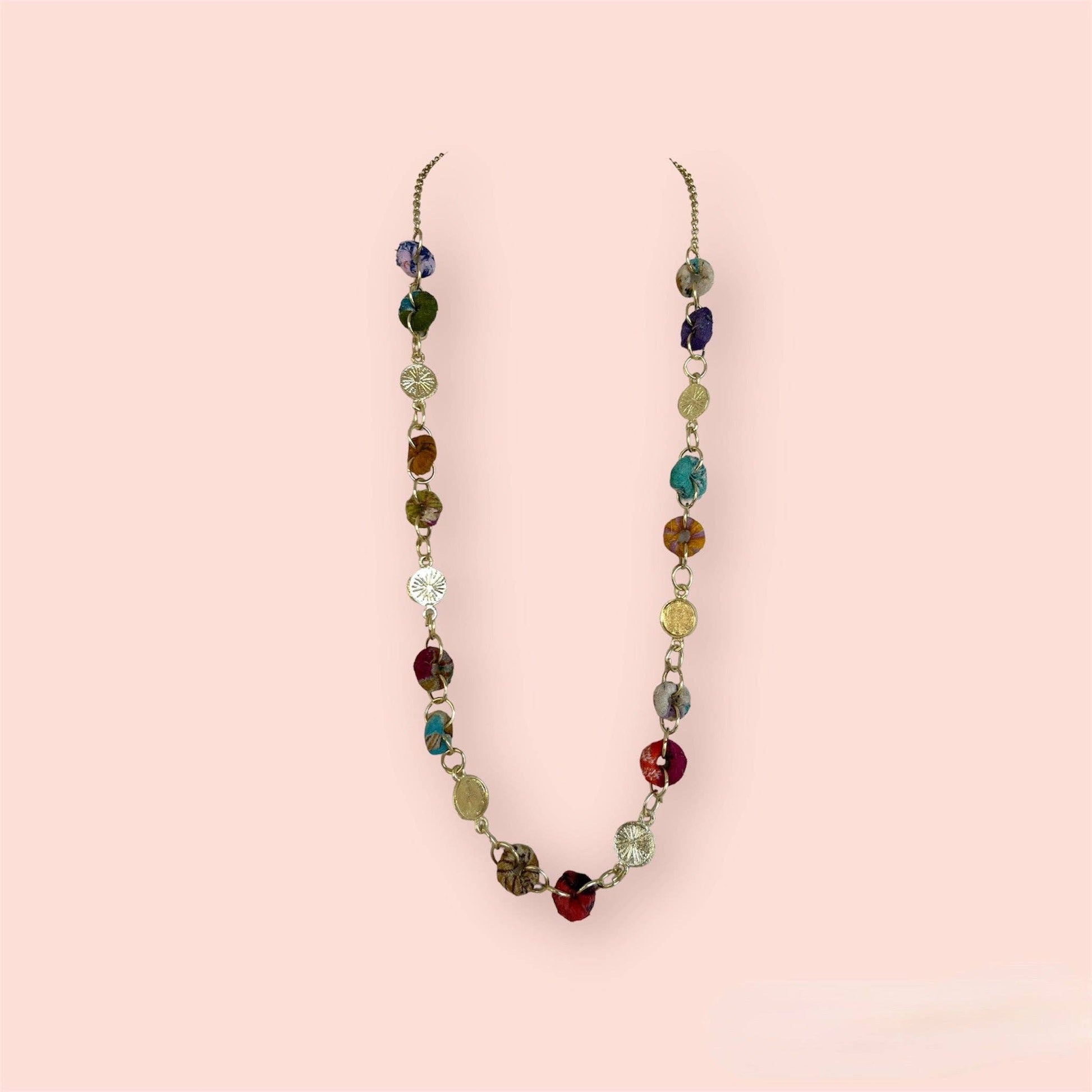 Lightweight yet dressy for any occasion. This single strand necklace has been made from repurposed wood beads wrapped in recycled sari. Each piece will vary as different colors and patterns of fabric are used to make the beads. Handmade in India by women artisans working with fair trade partners. Size: 22" around, plus 2.5" extender