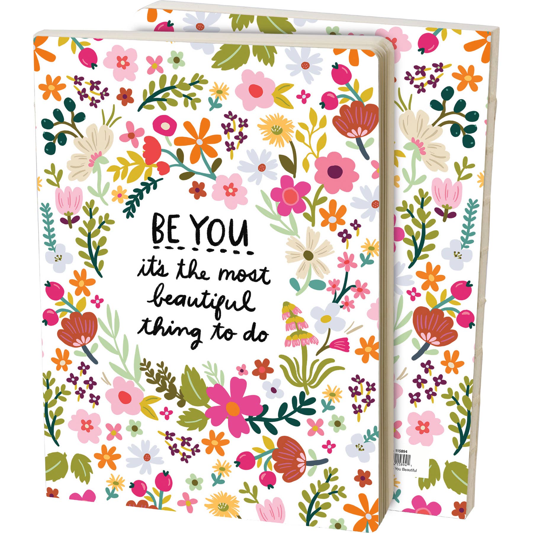 A double-sided journal displaying a shower of vibrant hand illustrated flowers surrounding a motivational sentiment that reads "Be You - It's The Most Beautiful Thing To Do." Back cover displays a coordinating all-over flower design. Our Be You Beautiful journal contains 160 lined pages and is designed to lay flat with an open spine. An inspirational and functional everyday accessory that is also great for gifting.