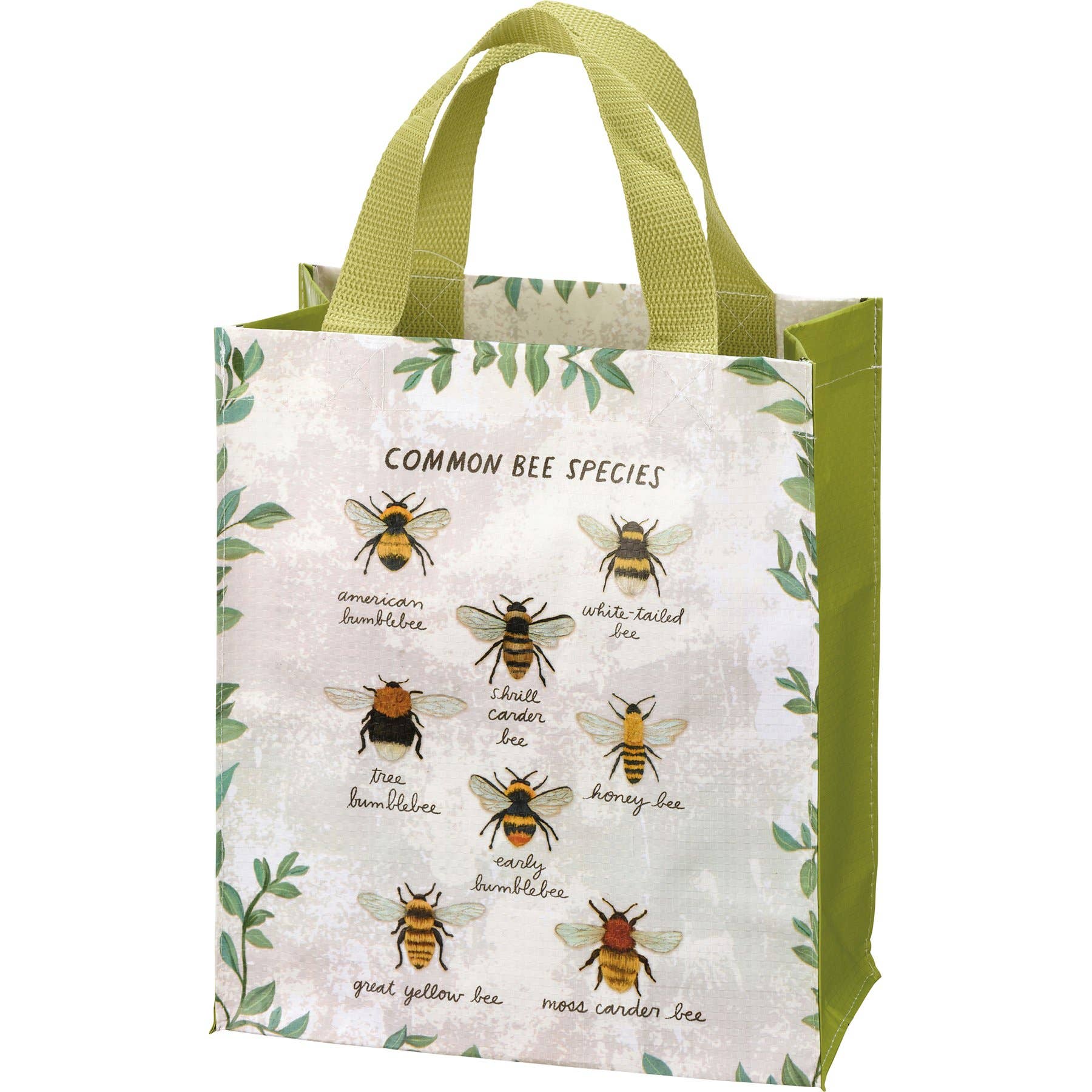 Made of post-consumer material, this double-sided daily tote from our Garden Collection features a "Common Bee Species" sentiment with various bee species designs accompanied by their names, all surrounded by greenery. Gusset features bright color for added interest.