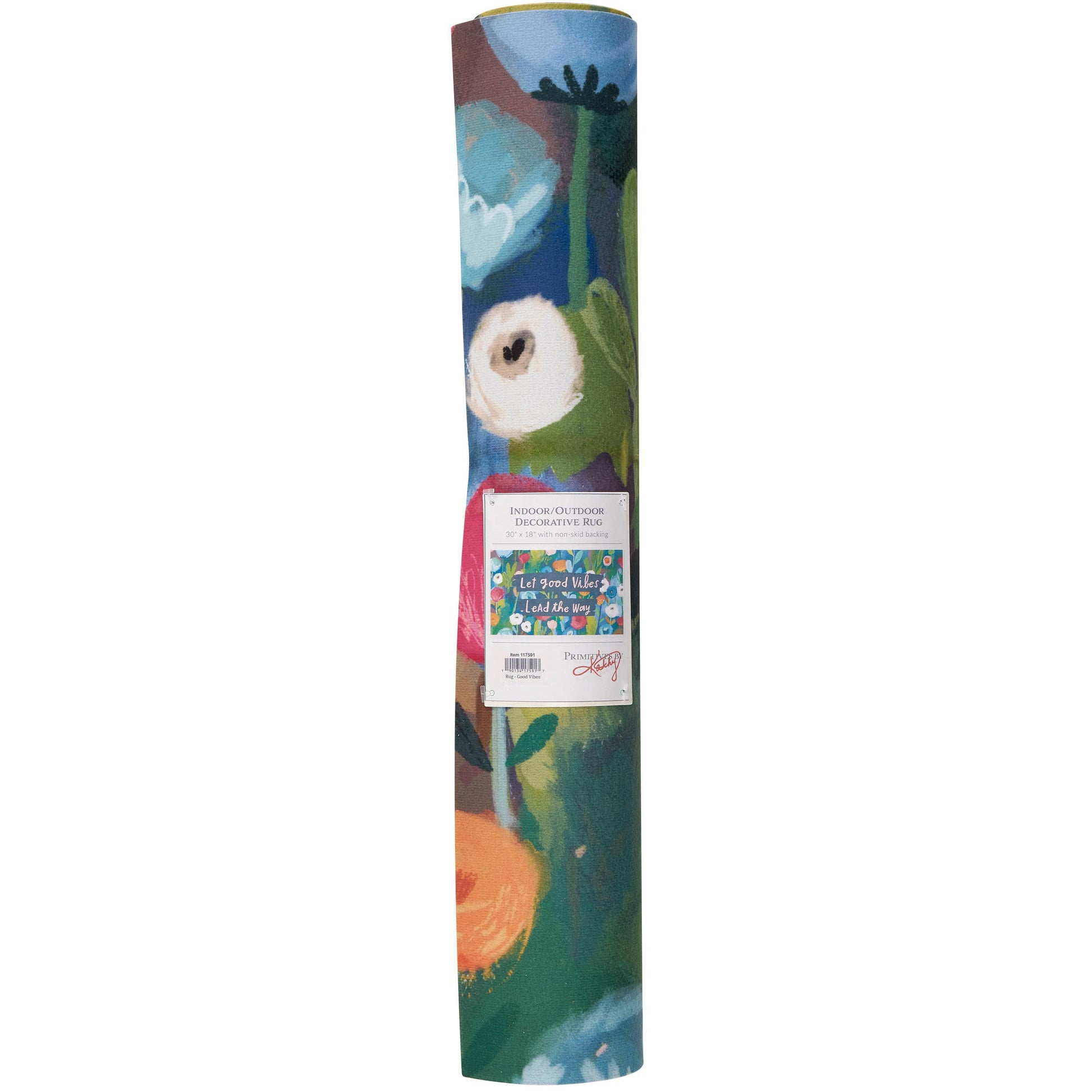 A polyester rug displaying a vibrant hand illustrated design of abstract florals behind and inspirational sentiment that reads "Let Good Vibes Lead The Way." Rug can be used indoor or outdoor and features skid-resistant backing to help stay in place. Spot cleaning recommended.