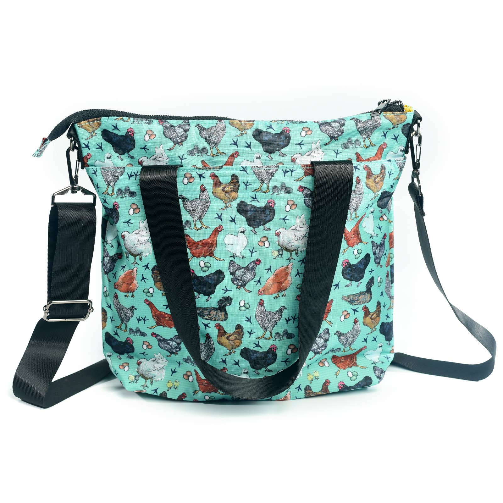 Welcome to the hen house! Featuring a nice variety of chicken breeds including the Silkie, Polish, Orpington, Barred Plymouth Rock, Australorp, Wyandotte, Red Broiler, Sussex, and White Plymouth Rock. These glorious hens, baby chicks, eggs and chicken tracks are pictured on a hatched minty blue-green background. The Sidetrack Crossbody features 2 exterior zippered compartments, an interior zippered pocket, a front flap pocket with a magnetic closure and a back velcro quick pocket. You can use the back pocket to keep your phone for fast access or to stow away your shoulder strap. -Bag measures 11.75" tall x 10.25"w wide x 4" deep -One detachable and adjustable 50" strap and one 10.5 “ drop shoulder strap with tuck-away velcro pocket. -Premium water resistant nylon made from recycled plastic, easy clean nylon liner. Metal Hardware.💧♻️