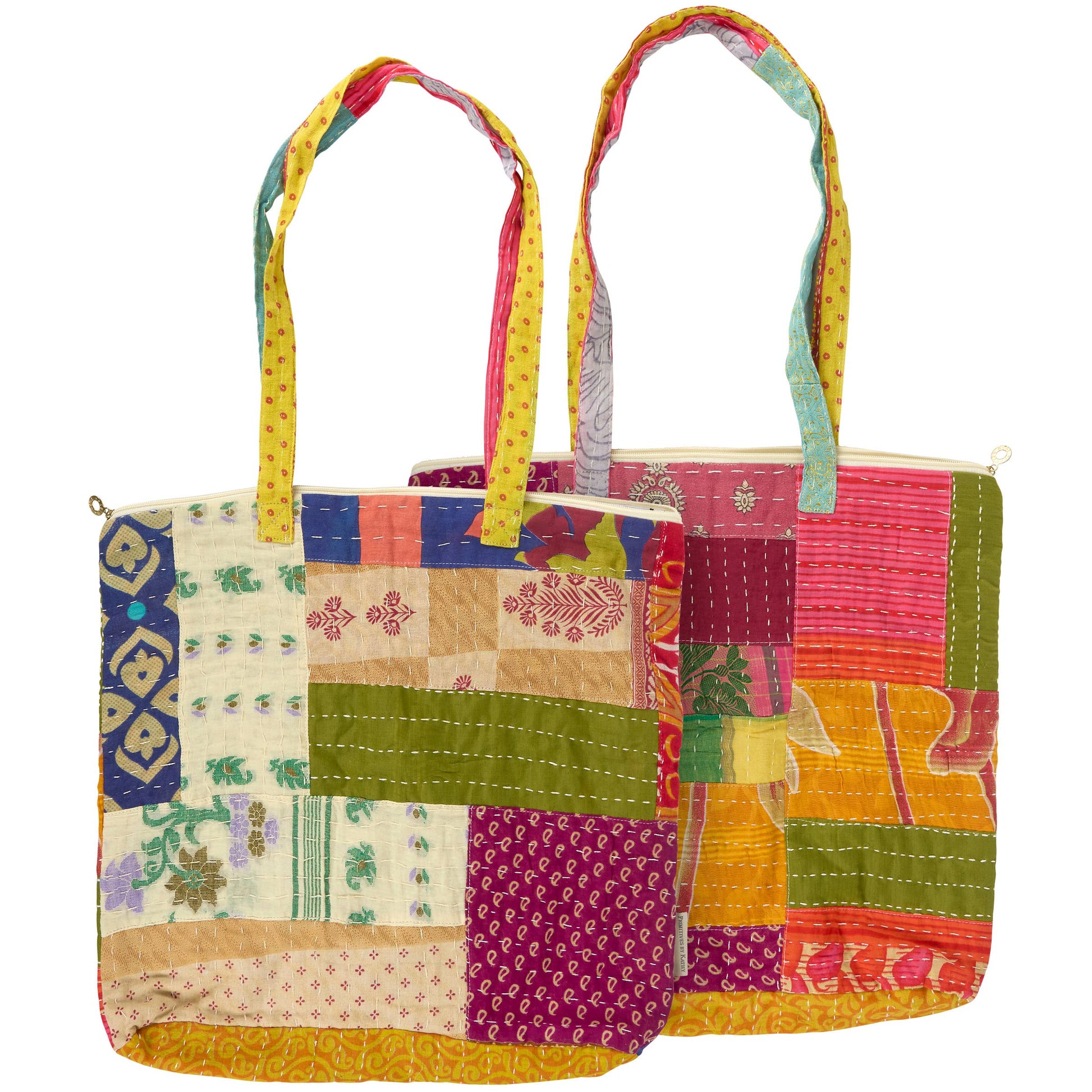 A large double-sided cotton tote displaying a colorful Kantha design. Kantha, or "patched cloth," items are crafted using various fabrics to give each design a unique combination of vibrant colors and beautiful patterns. Each purse is unique in colors and fabrics. The large Kantha tote includes 14 inch Kantha straps for easy carrying and a zipper to keep items secure. A stylish accessory perfect for shopping and daily activities.