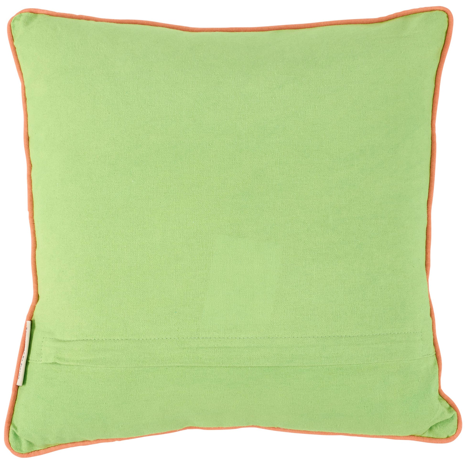 A decorative cotton throw pillow displaying vibrant hand illustrated designs of flowers surrounding an inspirational sentiment that reads "Love Always." Pillow features coordinating green color on back and orange piping along the edge. The Love Always pillow includes a zipper to easily remove and clean machine-washable pillow cover. An inspirational everyday home accent perfect for adding style to any room.