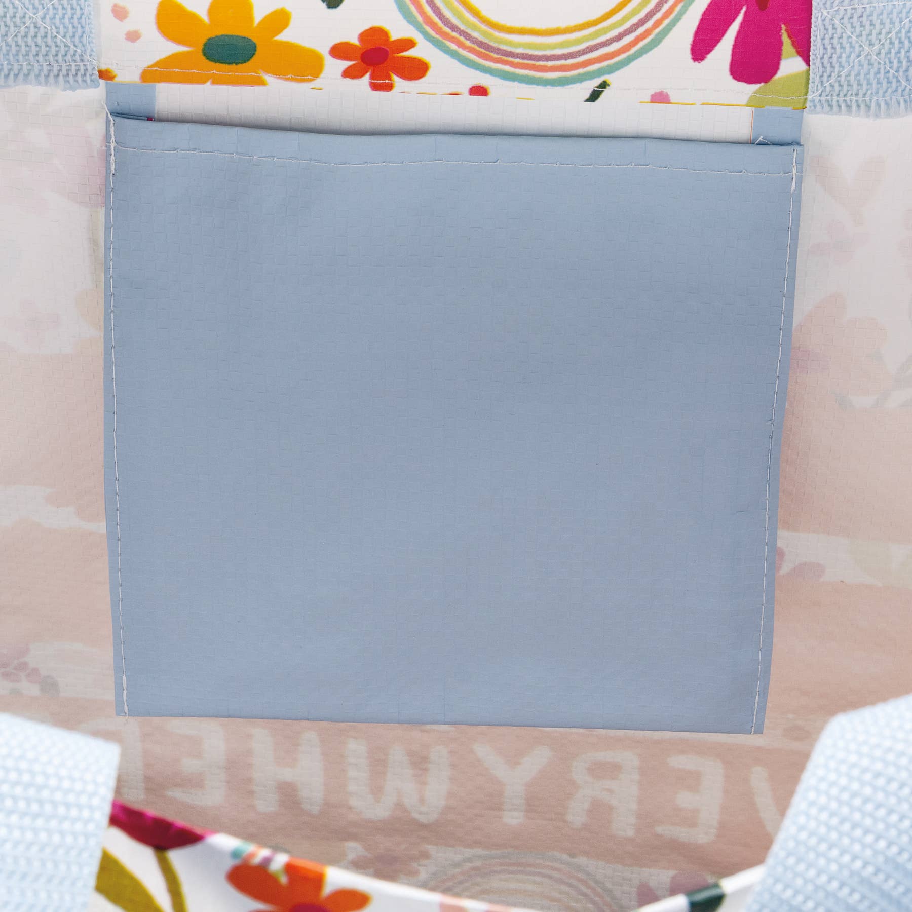 Made of post-consumer material, this double-sided shopping tote features all-over whimsical, vibrant floral and rainbow designs with "Love Grows Everywhere" sentiment. Gussets feature coordinating pattern. The Love Grows shopping tote contains an interior pocket and dual nylon hand and shoulder straps for easy carrying.