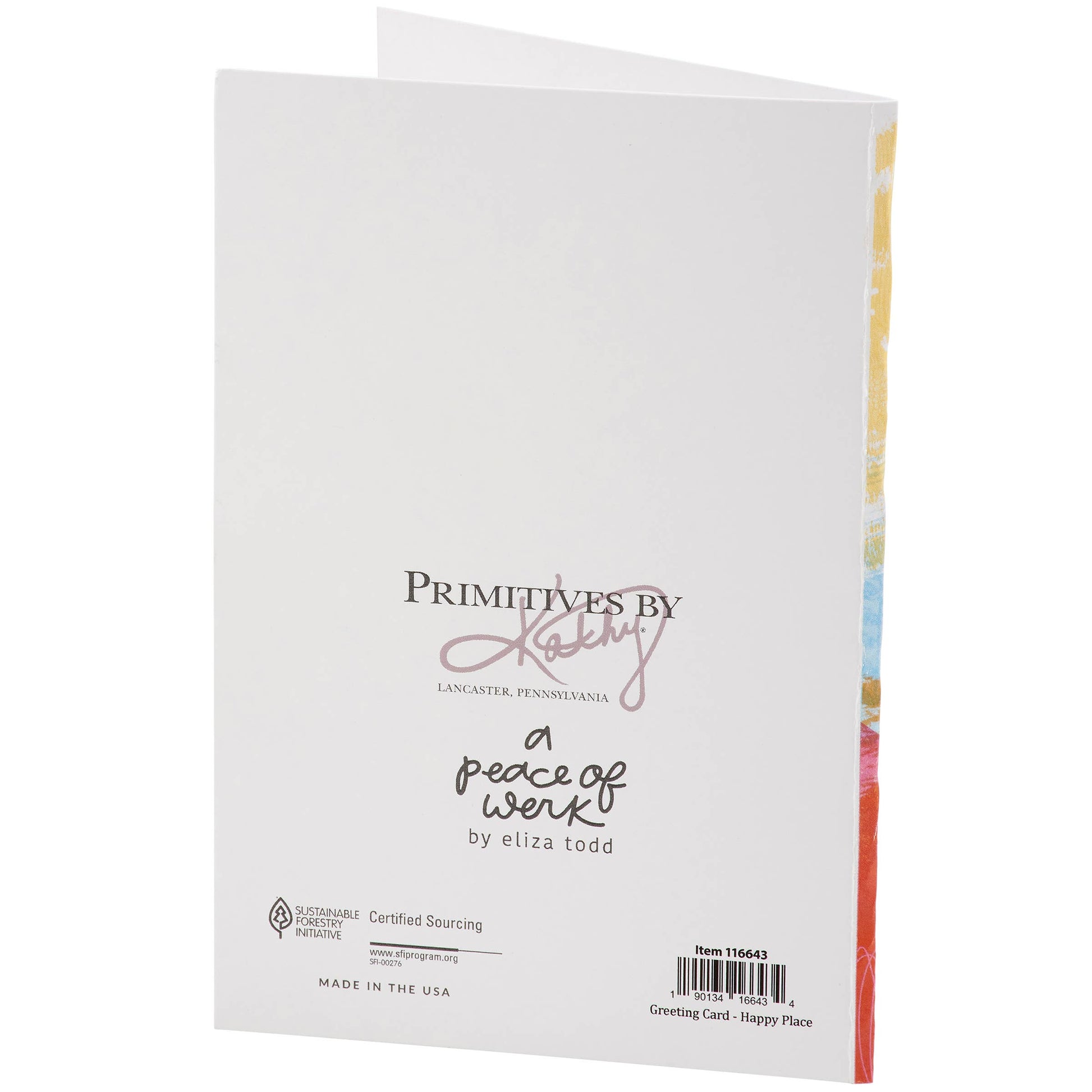 An inspirational greeting card displaying a hand illustrated abstract design in a warm color palette with a heartwarming sentiment that reads "You Are My Happy Place" and blank space inside to create a personalized message. Each card includes a brown kraft paper envelope for the perfect finishing touch. Proudly made in the USA.