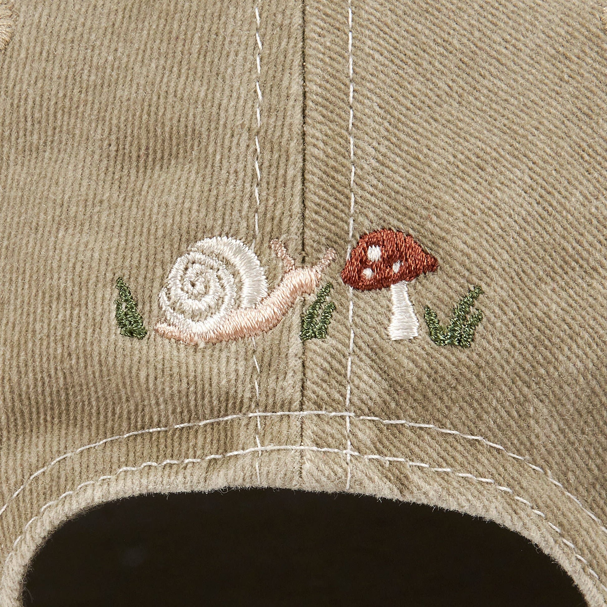A stonewashed tan baseball ca displaying a nature inspired design of mushrooms on the front with a snail and mushroom on the back. Nature hat features fully embroidered designs for added detail. The Snail & Mushroom baseball cap is one size fits most with an adjustable metal buckle to create the perfect fit. Hand wash only. A nature-themed gift perfect for an everyday accessory.